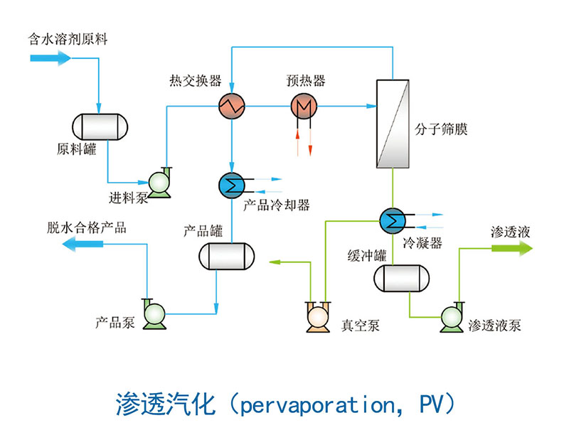 滲透汽化(pervaporation,PV)和蒸汽滲透(vapor permeation,VP)是在混合物組分化學(xué)位梯度推動下,利用各組分在膜表面吸附與擴(kuò)散速率的不同實現(xiàn)分離的過程。其中以液體形式供料稱為滲透汽化,以蒸汽形式供料稱為蒸汽滲透。滲透側(cè)通過抽真空冷凝(或氣體吹掃、吸附)的方式轉(zhuǎn)移收集滲透物。該技術(shù)具有以下顯著優(yōu)點: